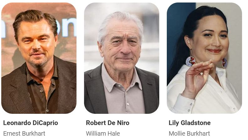 As the mystery deepens, a newly formed FBI begins to investigate. The film stars Robert De Niro, Leonardo DiCaprio, and Lily Gladstone.
